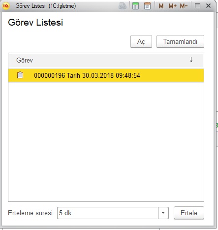 Anımsatma Formu: Görevler formu seçilen anımsatma seçeneğine ve tarihine göre ilgili kullanıcının tamamlanmamış görevlerini listeler. Bu ekrandan görev detaylarını görebilirsiniz. İleriki bir süreye erteleyebilirsiniz ya da görevi tamamlandı olarak kayıt edebilirsiniz.
