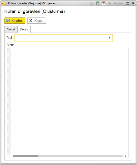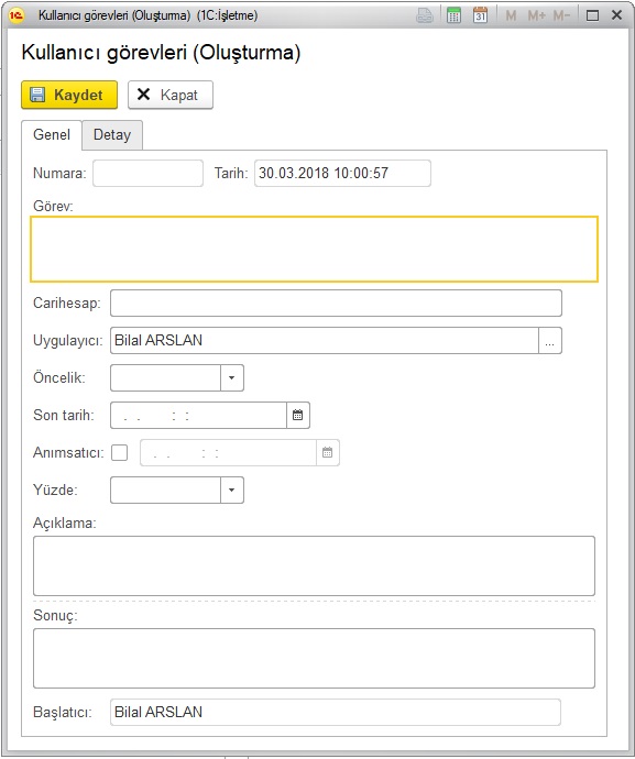 Görev Formu: Kullanıcı görevleri ekranında iken açarak görev tanımlaması yapabilirsiniz. Görevlerinizin önceliğini, son tarihini ve hangi cari hesabınız ise seçebilirsiniz. Görev tanım başlığını oluşturabilir, sonuçlarını yazabilirsiniz. Anımsatıcı oluşturarak ilgili görevi kendinize ya da diğer kullanıcılara hatırlatma yapabilirsiniz. Detay sekmesinde ise mailden görev aktarılmış ise bağlı olan mail detaylarını görüntüleyebilirsiniz.